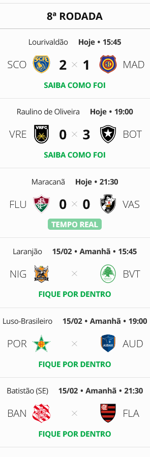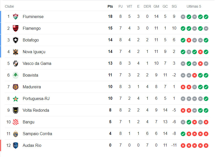 Com o empate por 0 a 0 contra o Fluminense, o Vasco chegou a 13 pontos e está na 5ª colocação na Taça Guanabara. O Gigante da Colina encerrará a 8ª rodada fora do G4.