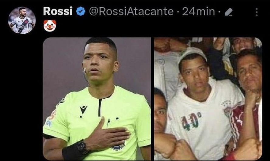 O atacante Rossi e o zagueiro Medel, ambos do Vasco, correm o risco de serem punidos desportivamente por causa de postagens nas redes sociais. Nesta quarta-feira, após o clássico contra o Fluminense, a dupla postou uma montagem em que de um lado aparecia o árbitro da partida, Bruno Mota Correia, e do outro lado um jovem com a camisa tricolor, dando a entender de que eram a mesma pessoa. A imagem carece de comprovação.