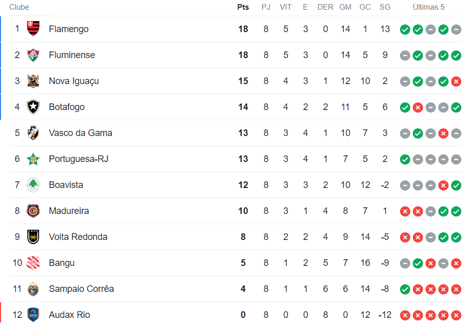 Vasco termina a 8ª rodada da Taça Guanabara na 5ª colocação, fora do G4; veja a classificação