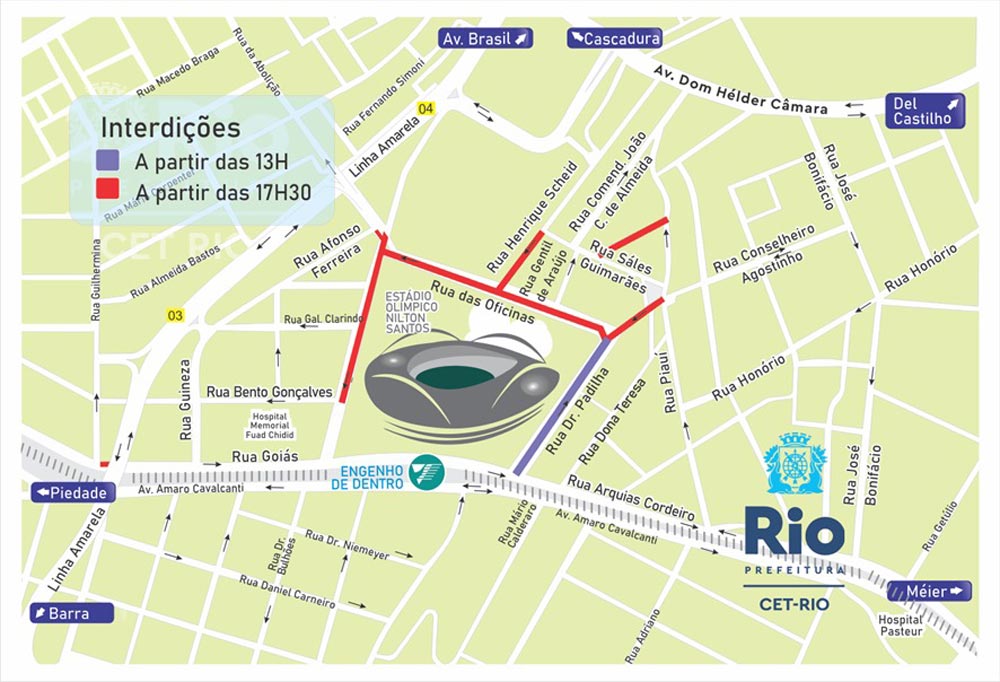 O Centro de Operações Rio, através da CET-Rio, implantará planejamento de trânsito, neste domingo, dia 18/02, para o jogo entre Botafogo e Vasco da Gama, que acontece às 16h, pela 9ª rodada do Cariocão 2024, no estádio Nilton Santos, em Engenho de Dentro. A partir das 13h, haverá interdição ao trânsito de veículos na região onde acontece a partida. É importante que todos fiquem atentos e respeitem as orientações dos agentes de trânsito e as sinalizações.