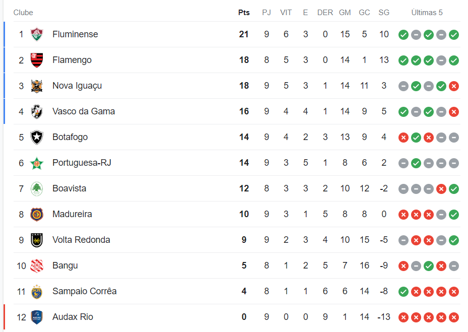 Confira a classificação da Taça Guanabara após os jogos deste domingo: