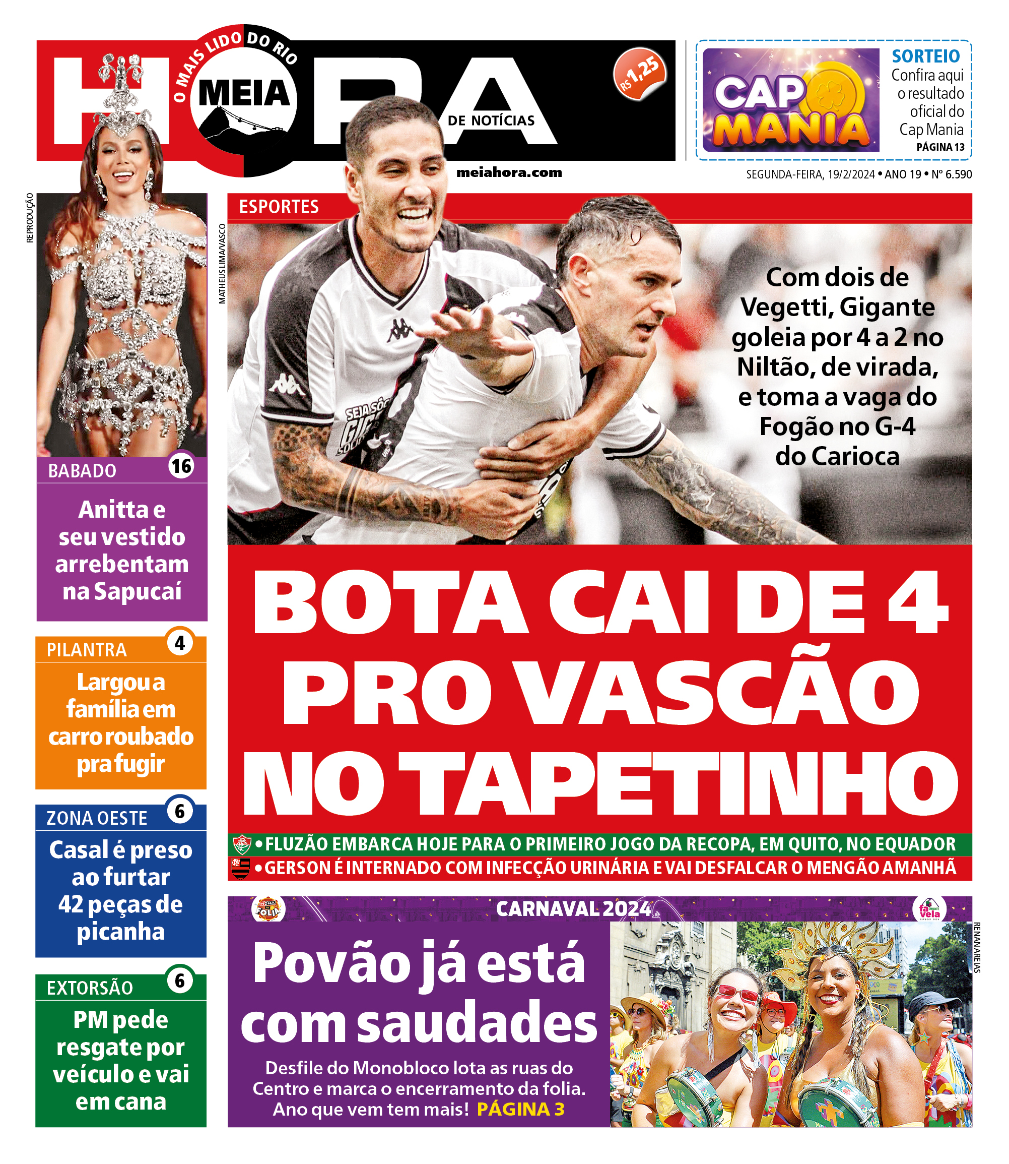 Pelo Campeonato Carioca, o Vasco derrotou o Botafogo por 4 a 2 no Engenhão com gols de Vegetti (2), Galdames e Lucas Piton. Veja as capas dos jornais.