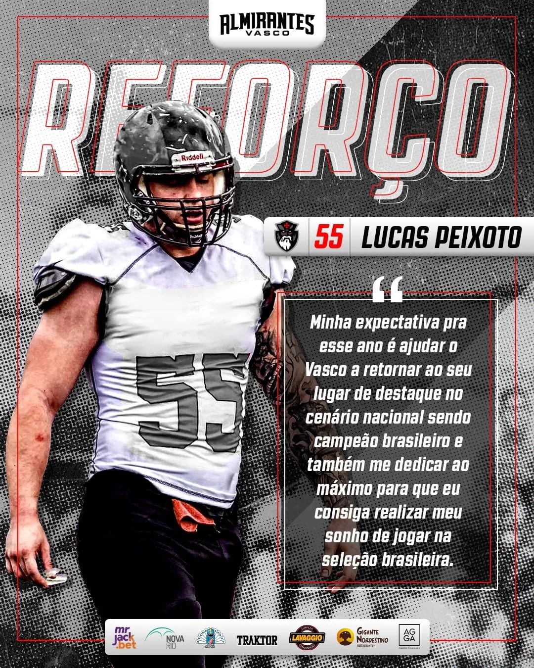 O TE Lucas Peixoto chega para reforçar o Vasco Almirantes em 2024! O jogador que estava no flamengo imperadores se junta ao time da colina na busca do tĂtulo da BFA!