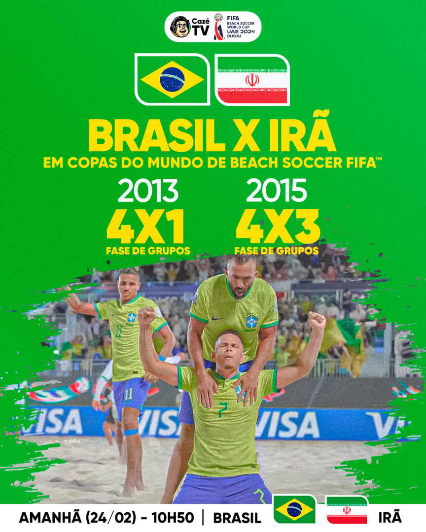 AMANHÃ, o Brasil encara o Irã na semifinal da Copa do Mundo de Beach Soccer da FIFA™️, tá? 🔥 Nas duas vezes que esse confronto rolou, deu Brasa! 🇧🇷🏖️ Será que amanhã vem mais uma vitória? 👀