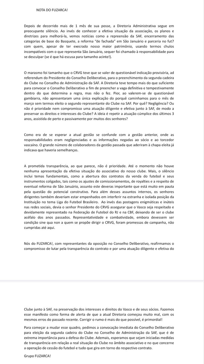 Fuzarca publica nota sobre o início da atual administração do Vasco