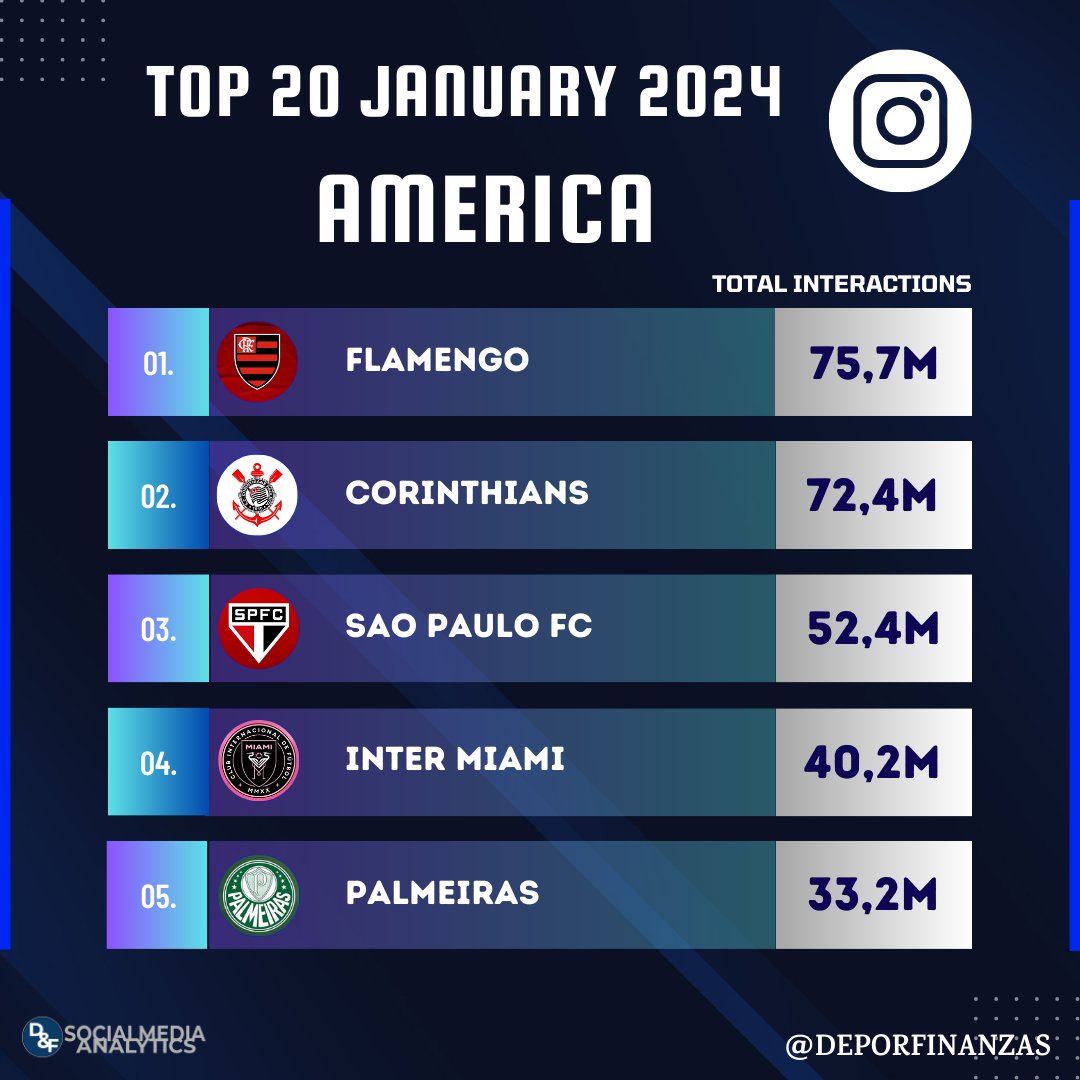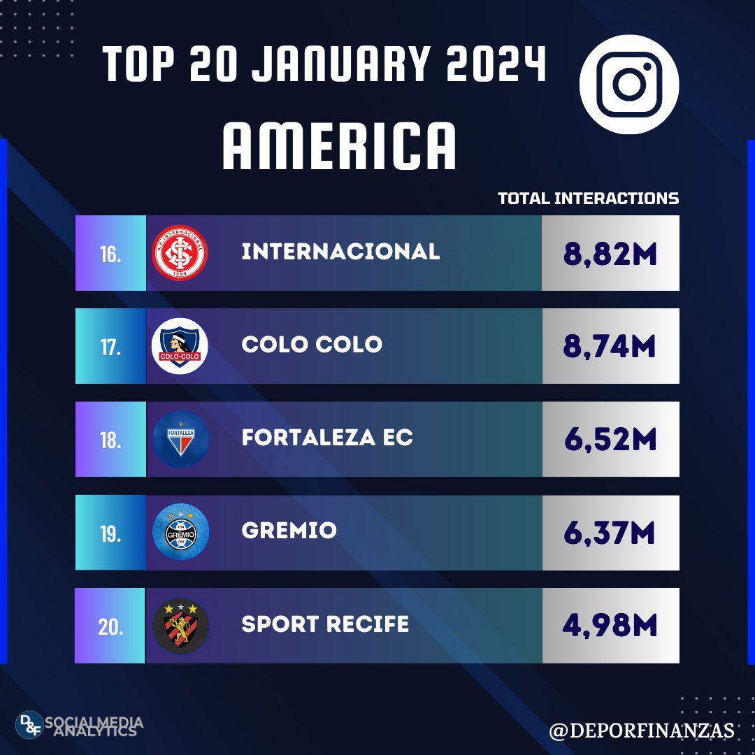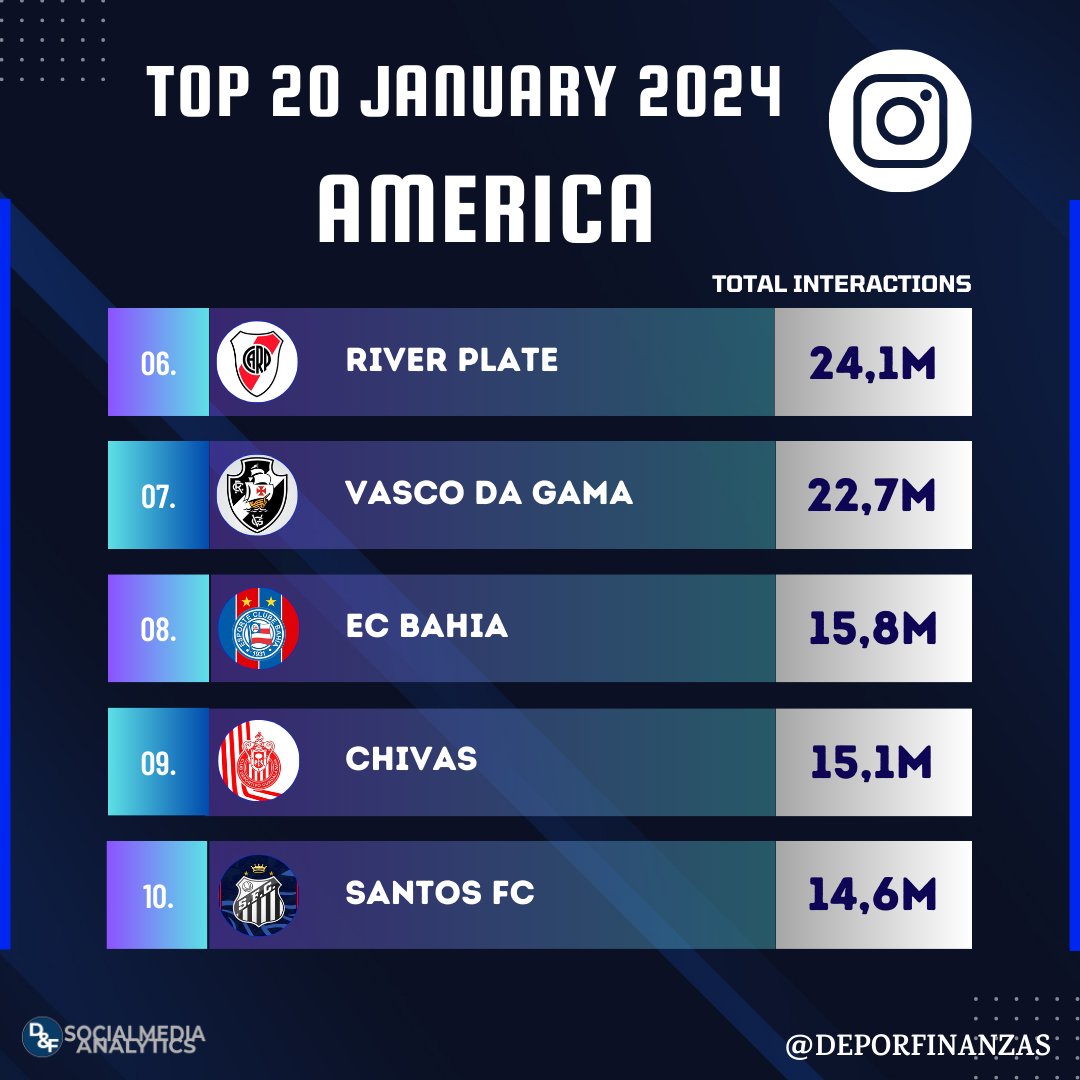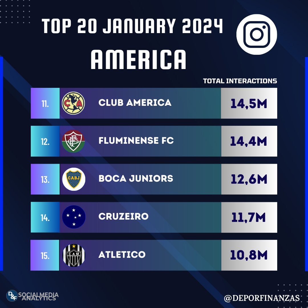 📲⚽ ¡Los 20 clubes de América con más interacciones en #instagram durante enero 2024!💙💬