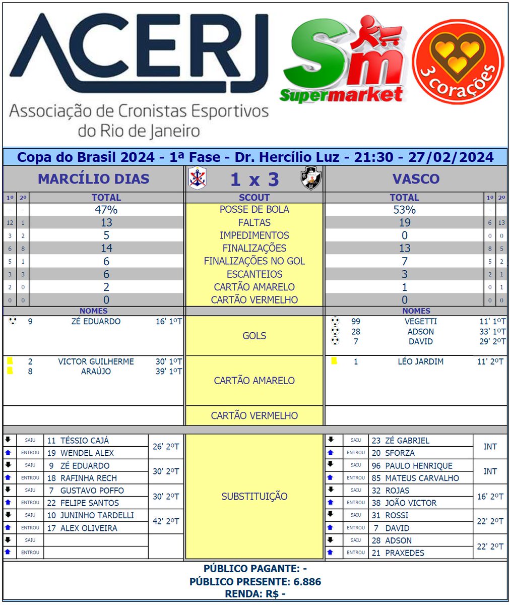Com a vantagem consolidada no placar, os cariocas passaram a administrar mais o resultado. O Marcílio Dias ainda tentou diminuir o prejuízo nos minutos finais, mas não teve força para reagir.