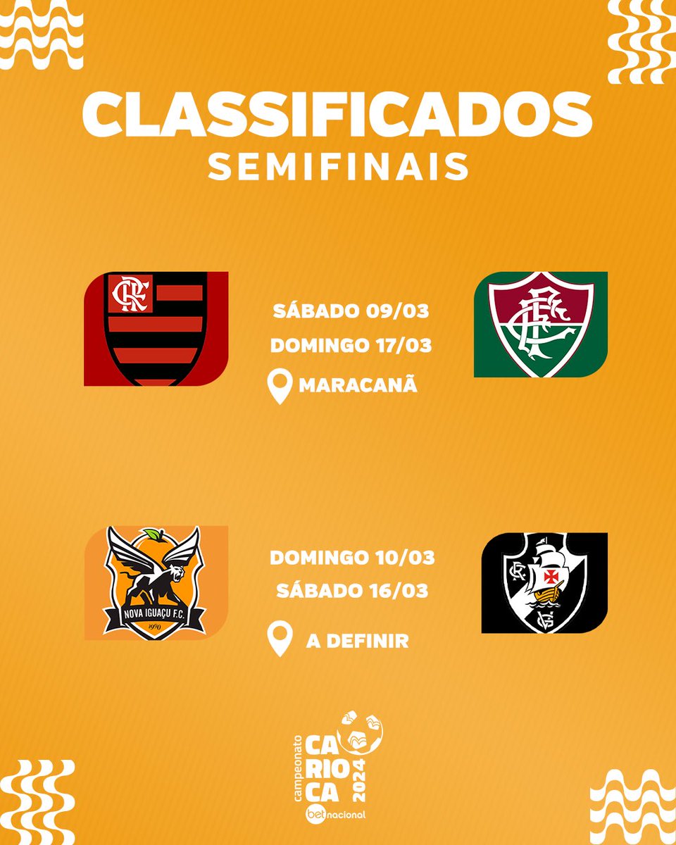 DEFINIDOS OS CONFRONTOS! Teremos FlaxFlu no @maracana em uma chave e na outra Nova Iguaçu e Vasco! Os horários das semis e os palcos de Nova x Gigante serão definidos nesta segunda. ✅⚽️