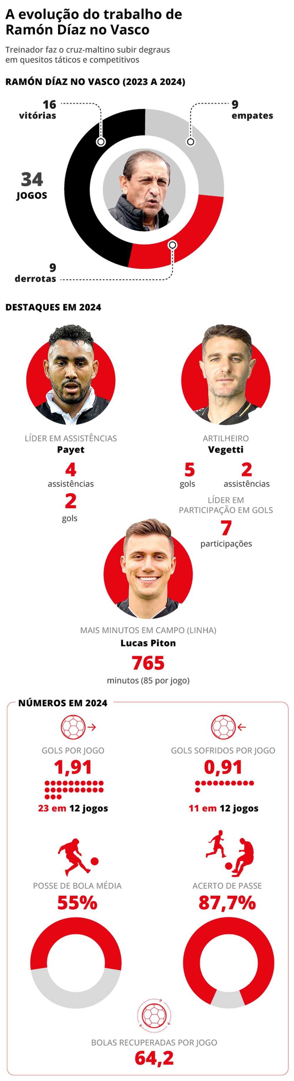 Se o Vasco terminou o último Brasileiro se salvando de um rebaixamento quase consumado, muitos dos méritos, além do elenco, são do trabalho da atual comissão técnica. Desde que Ramón Díaz e Emiliano — filho, auxiliar e hoje quase um segundo treinador — assumiram a equipe, o cruz-maltino se tornou um time muito complicado de se enfrentar.