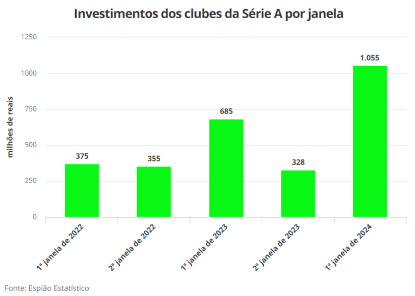Os cofres abertos deste início de temporada mostram que as equipes mudaram o comportamento em relação às últimas janelas. Os times da Série A estão gastando mais em um menor número de peças para o elenco. Por exemplo, na 1ª janela de 2023 foram 685 milhões de reais em 228 reforços. Neste ano, são 1,055 bilhão em apenas 171 contratações. Veja abaixo: