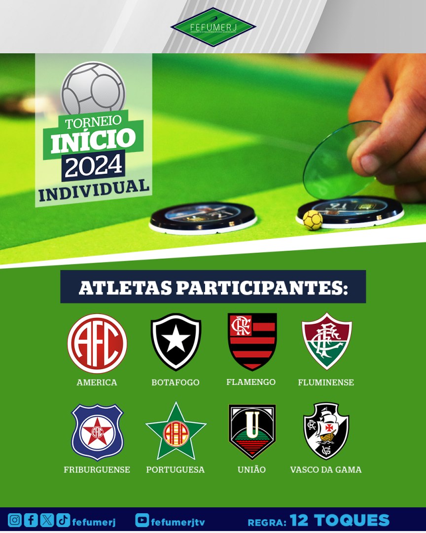 Com representantes do America FC @sanguefutmesa, Botafogo FR @bfrfuteboldemesa, CR Flamengo @flafutmesa, Fluminense FC @flufutmesa12toques, Friburguense @affmfutmesa, AA Portuguesa @lusafutmesa, União FM @futmesa_uniao e do CR Vasco da Gama @vascofutmesa, o Torneio Início Individual acontece neste domingo (10/3), às 9h, na sede do CT Botafogo Futmesa.
