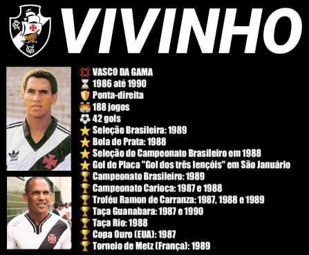 Exatos 63 anos do nascimento do saudoso vascaíno Vivinho. Integrante da 'SeleVasco' no Bicampeonato Carioca 87/88 e Brasileiro 89. O ponta-direita entrou tbm para a história do Vasco pelo famoso 'gol dos 3 lençóis' em 88 contra a Lusa. Era natural de Uberlândia-MG e faleceu 2015.