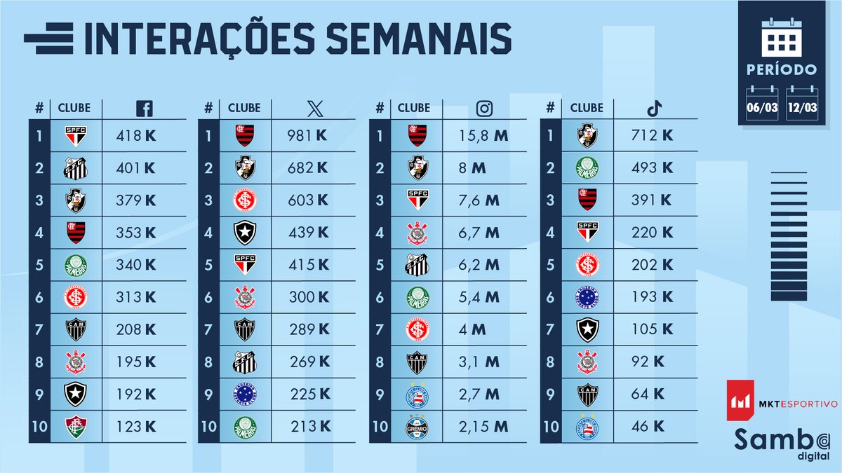 A constância do @Flamengo no Instagram impressiona. Nas últimas três semanas, o clube se manteve na casa de 15 milhões de interações.