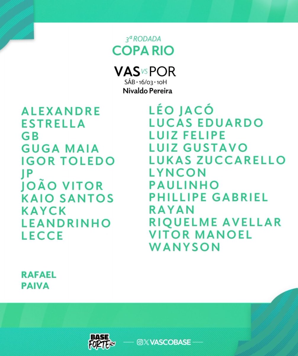 Depois de muito sucesso no Sub-17, o trio Estrella, Rayan e GB volta a ser relacionado para uma partida. Eles estão hoje à disposição do técnico Rafael Paiva para a 3a rodada da Copa Rio, diante da Portuguesa. O Vasco tem 100% de aproveitamento em 2 jogos. 10h na Vasco TV!
