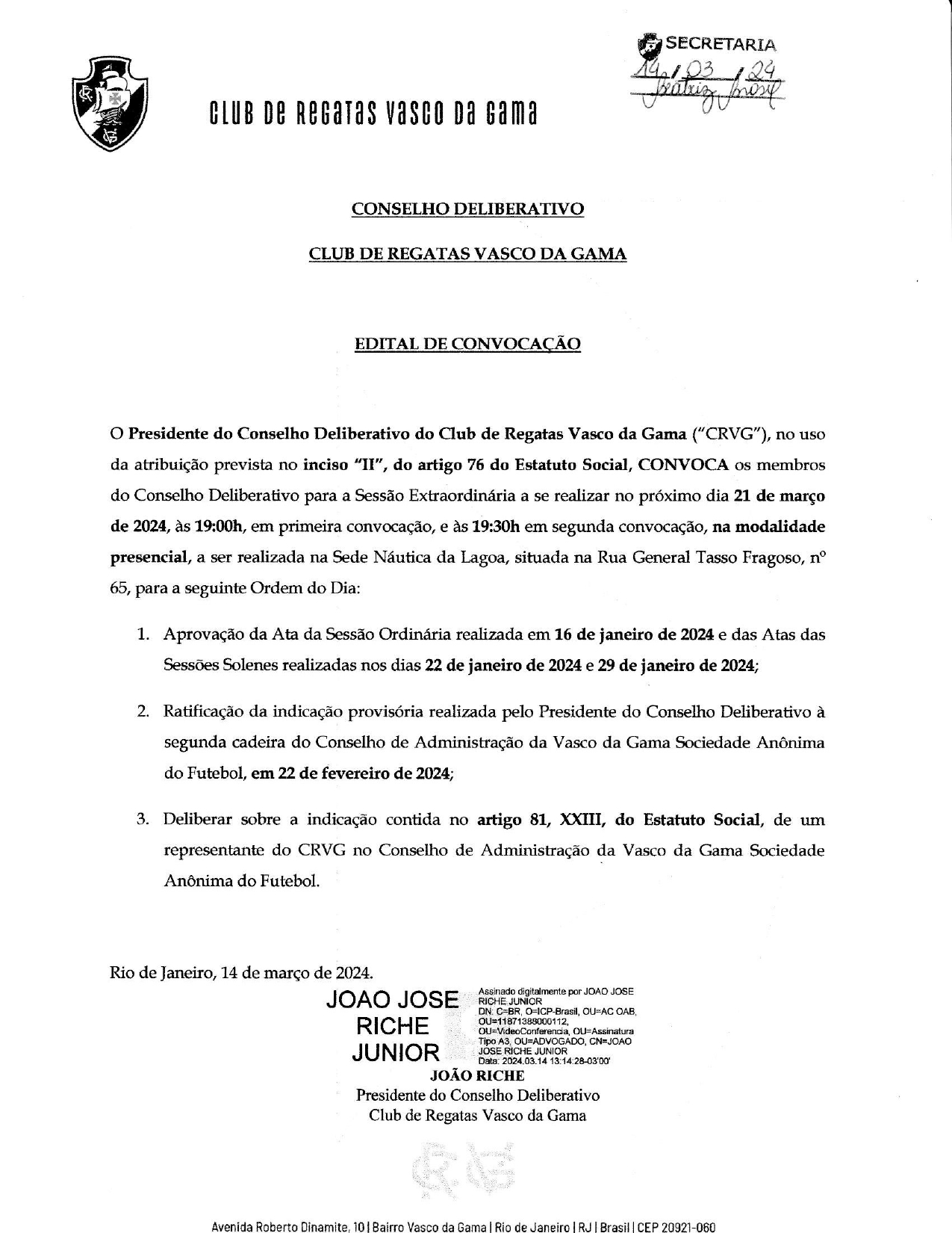 12/03/24 - Pedrinho indica Alexandre Cordeiro Macedo, presidente do Cade, para o Conselho de Administração da Vasco SAF