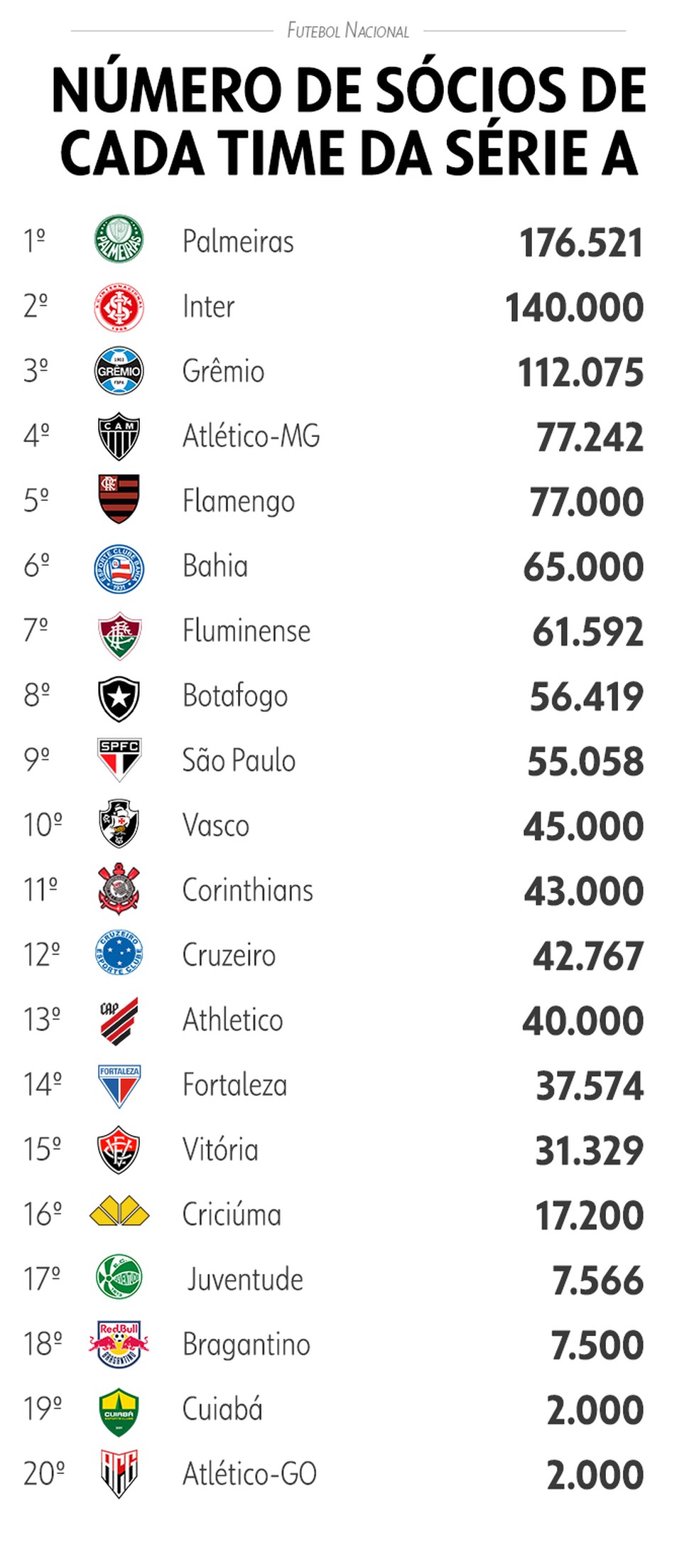Qual clube possui mais sócios no futebol brasileiro? O ge consultou os times da primeira divisão do Brasileirão e elaborou um ranking atualizado com o número de associados de cada um, conforme informações disponibilizadas pelos clubes à reportagem ou em sites oficiais (confira abaixo).
