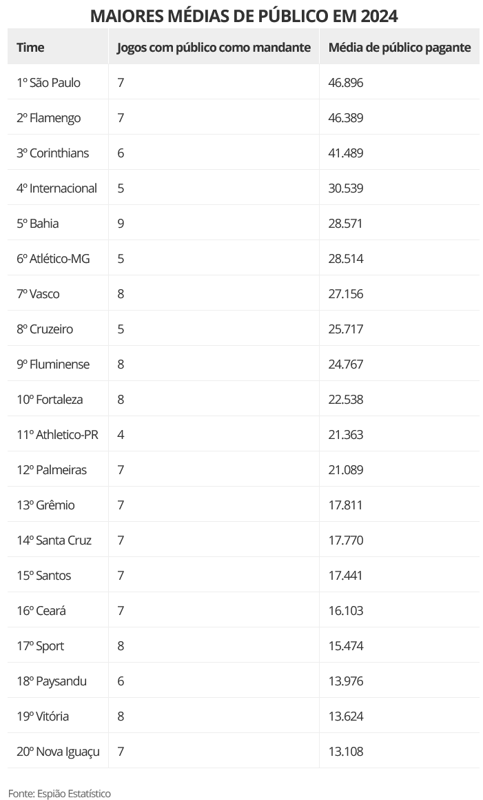 Em terceiro na lista aparece o Corinthians, com média de 41.498 pagantes por jogo. Internacional (30.539) e Bahia (28.571) completam o top 5. Seis equipes da Série A ficaram fora do top 20: Botafogo (11.805), Criciúma (9.691), Juventude (6.135), Bragantino (4936), Atlético-GO (4.234) e Cuiabá (986).