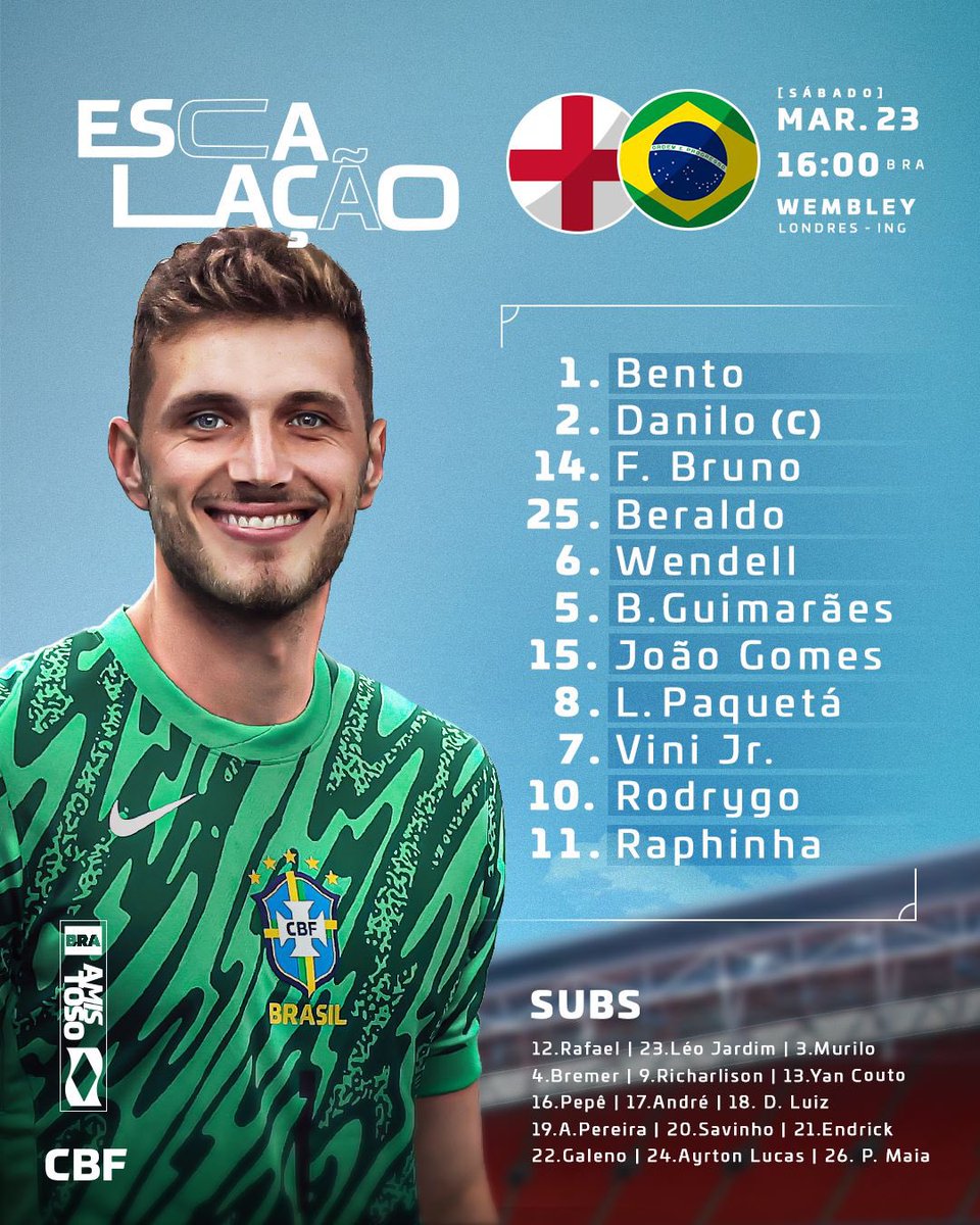 Confira a escalação da seleção brasileira pra esse jogo contra a Inglaterra
