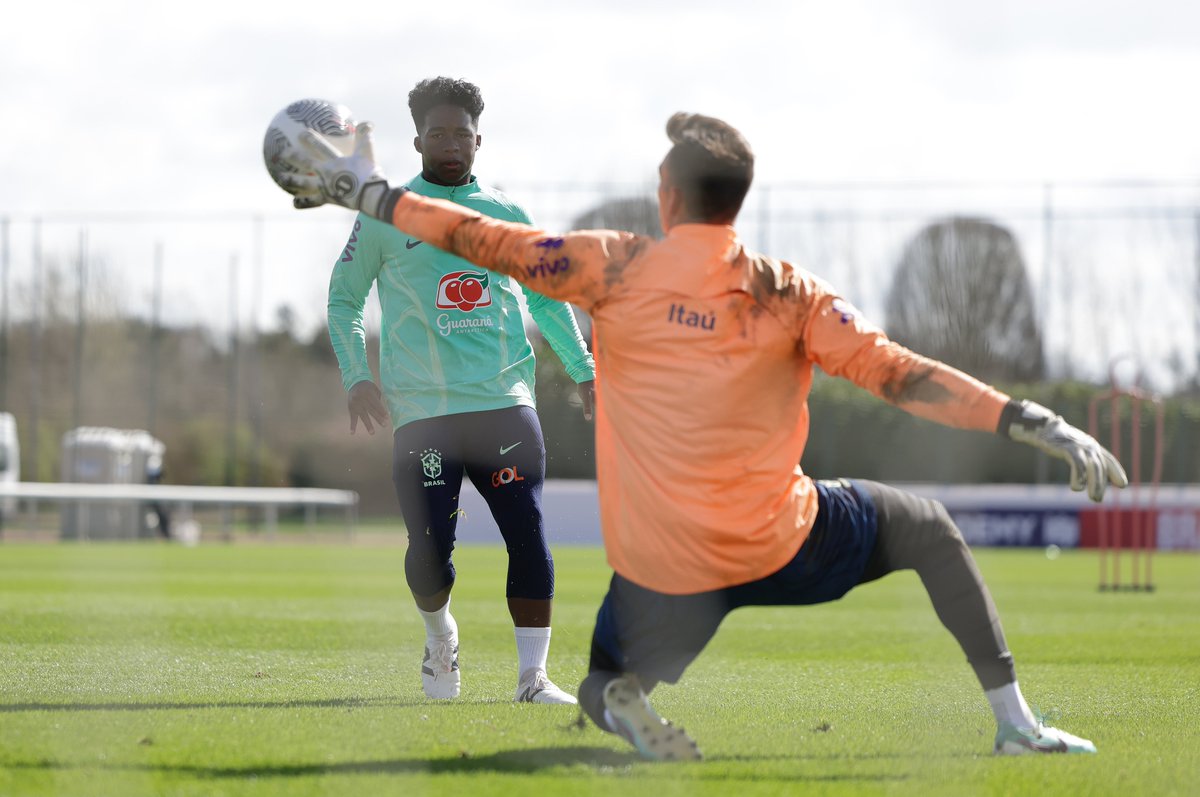 Veja foto de Léo Jardim defendendo chute de Endrick em treino da Seleção Brasileira