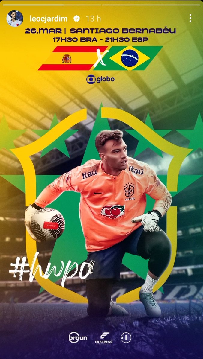 Léo Jardim publica arte de amistoso Espanha x Brasil em seu Instagram; veja