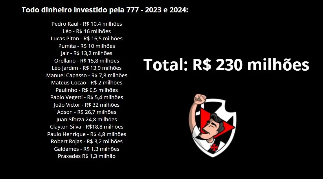 A 777 investiu pesado no Vasco, apesar das dificuldades do clube nos últimos anos. Disputou para não cair em 2023 e foi eliminado pelo Nova Iguaçu no Campeonato Carioca de 2024.