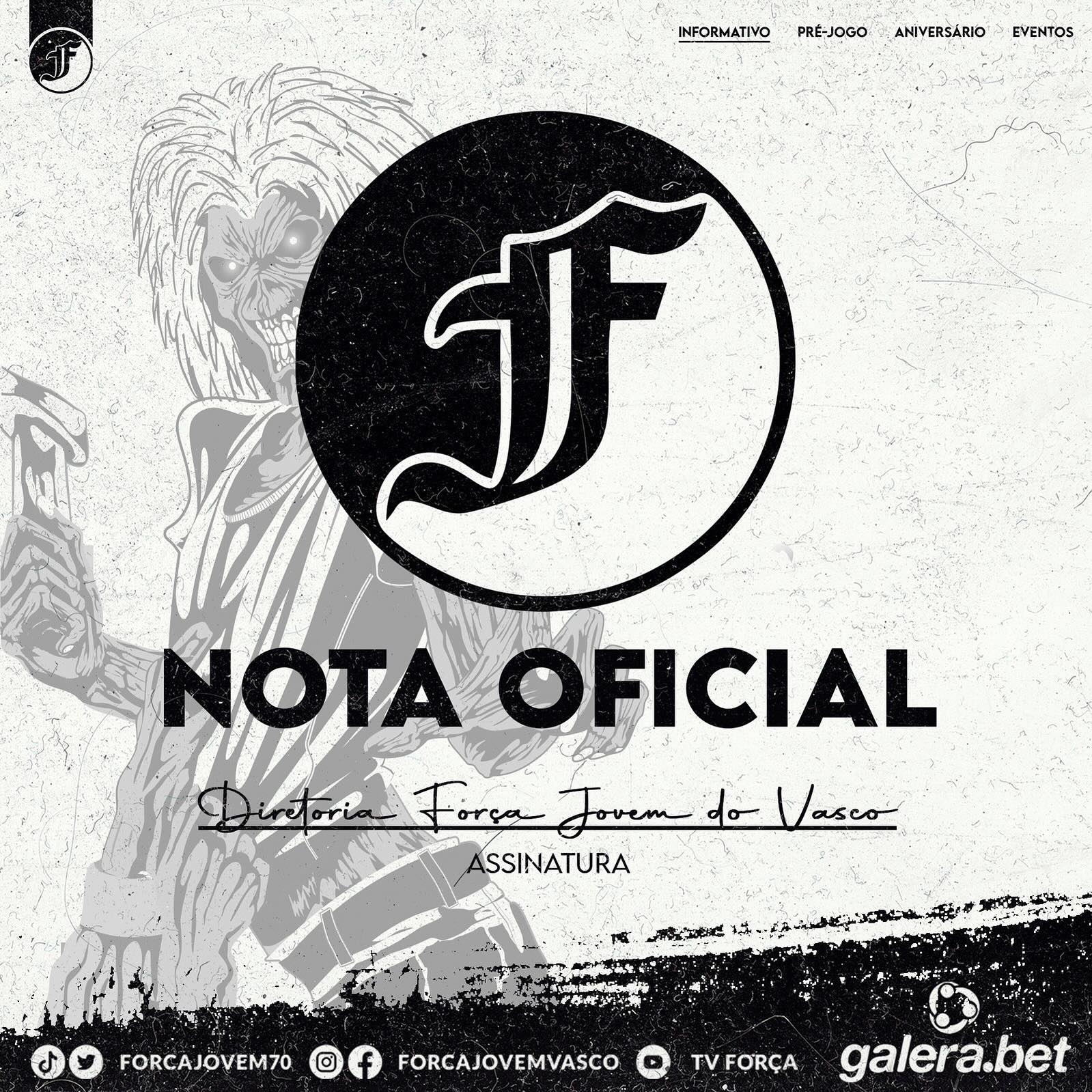 Hoje, 3 de abril de 2024, acaba de sair uma matéria em vários meios de comunicação, na qual citam o nome da Força Jovem como suposta ação contra grupo de torcedores do flamengo num jogo de futebol feminino em São Januário, que o MP (Ministério Público) em recomendação da Polícia Militar, pretende punir a FJV e a GDA por 60 dias, uma perseguição sem fim contra a torcida do Vasco, e sempre a mesma pessoa, será que é consciência.