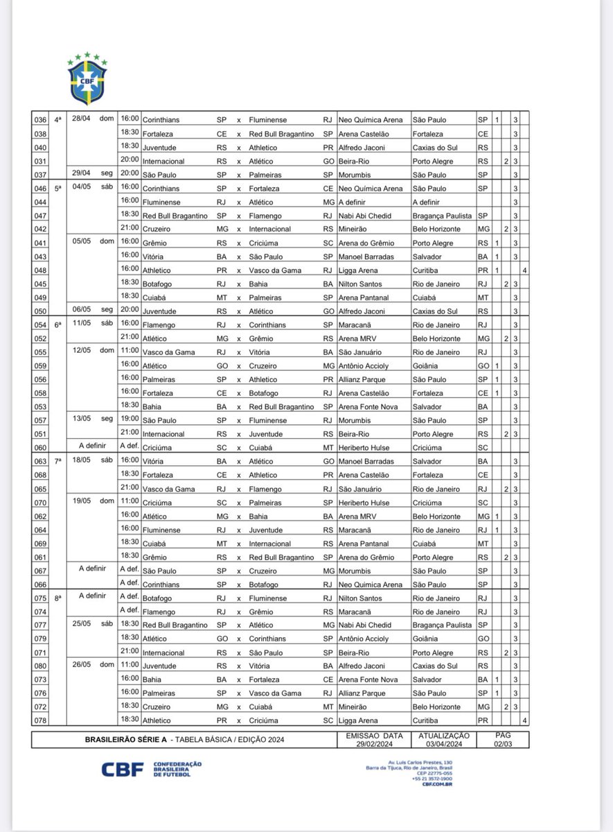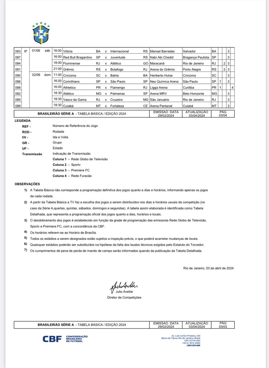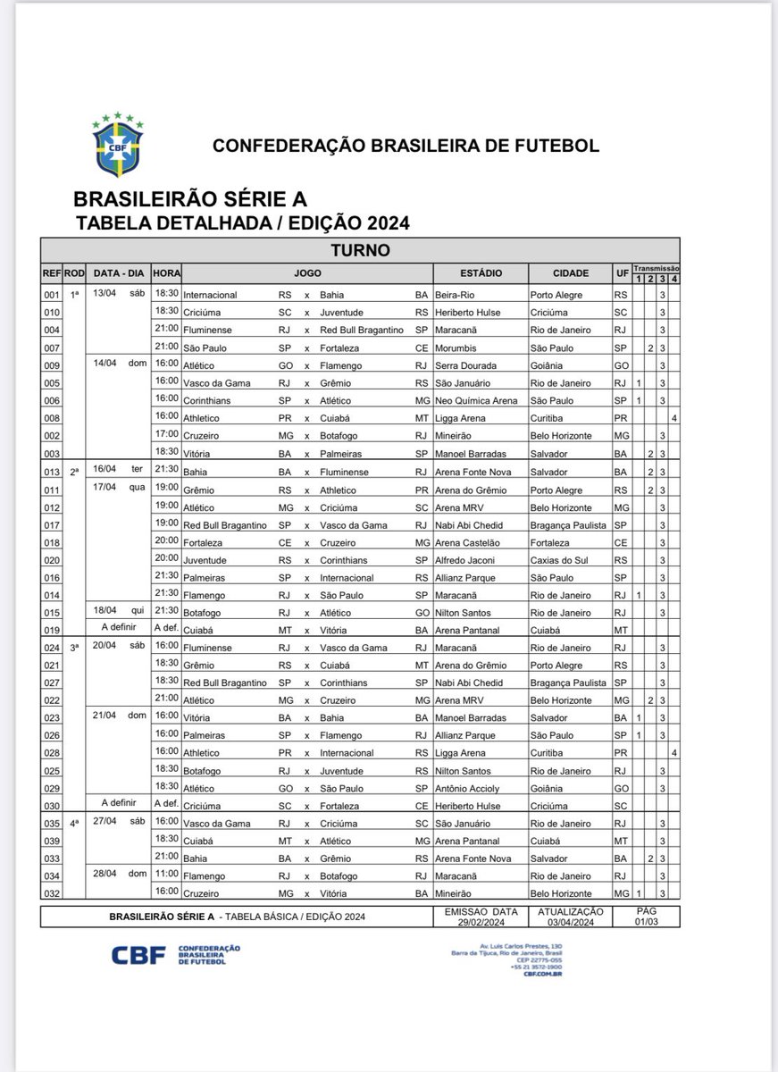 CBF detalha as primeiras rodadas do Brasileiro; Vasco x Grêmio será no dia 14/04, domingo, às 16h em São Januário