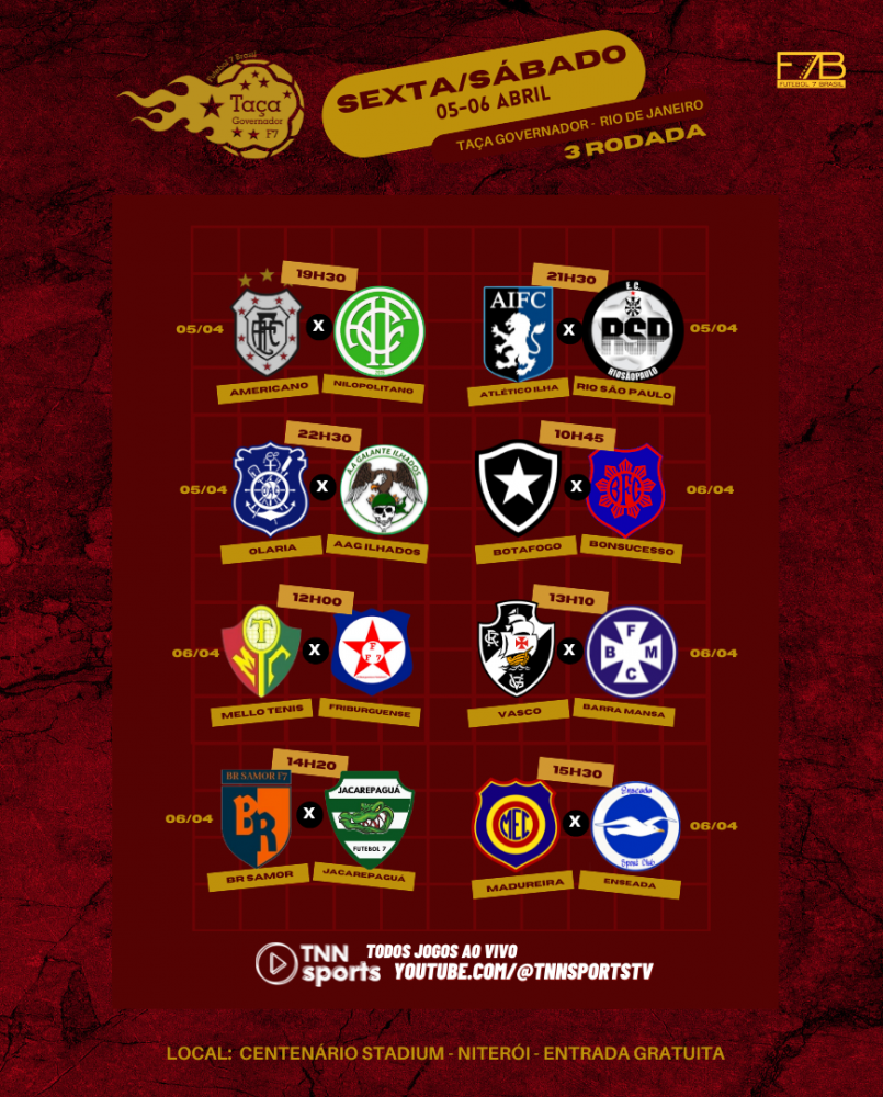 A taça Governador RJ 2024 reúne as 16 melhores equipes de Futebol 7 do Estado do Rio de Janeiro e é o evento que abre a temporada 2024 do futebol 7 carioca. a terceira rodada da competição definirá os oito clubes classificados para fase do playoff final.