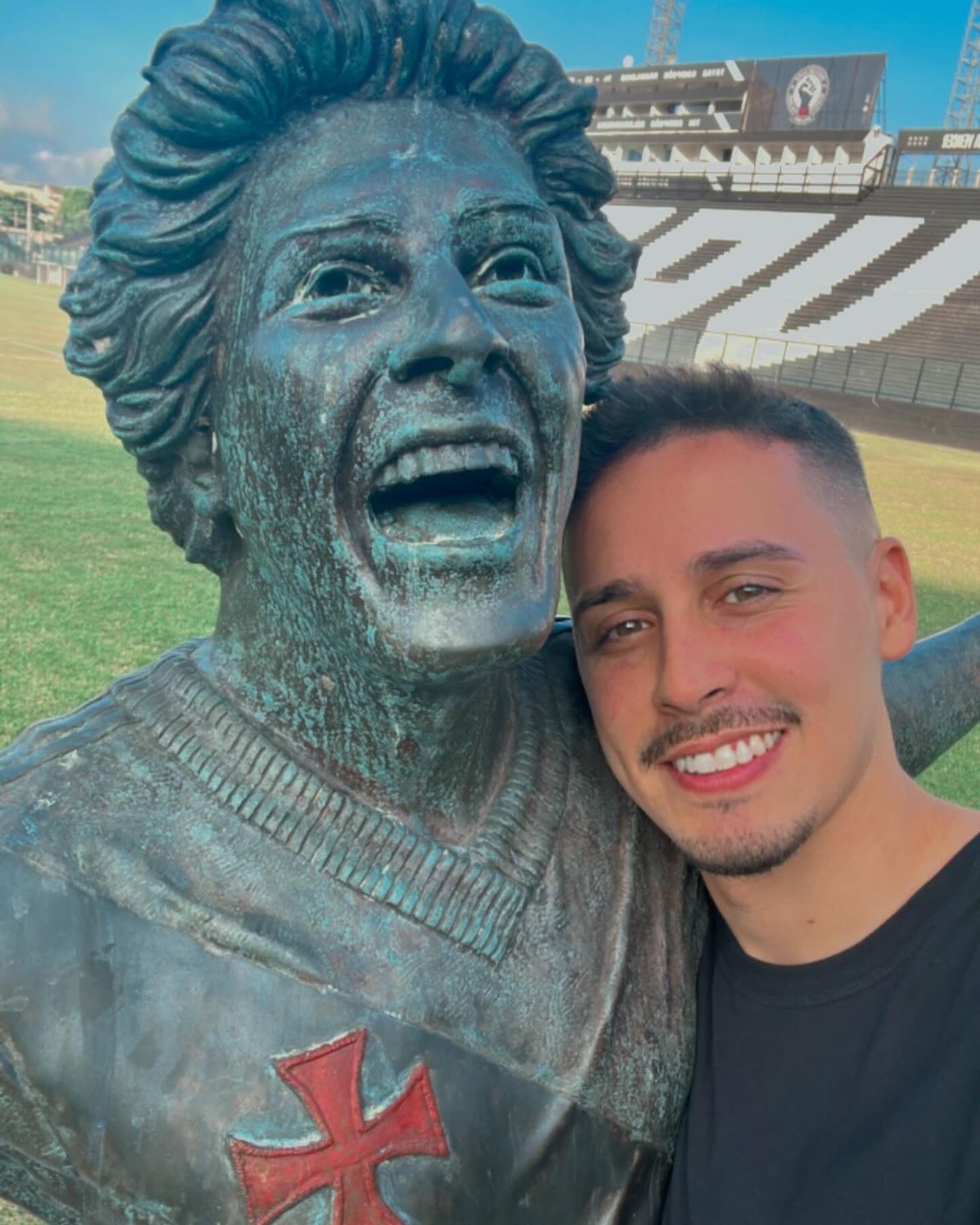 Rodrigo Dinamite posta foto ao lado da estátua do pai em São Januário: 'Saudade'