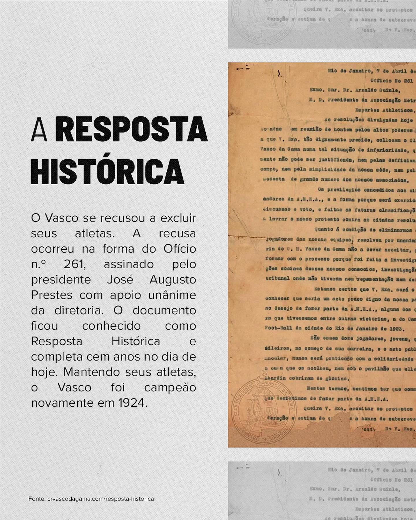 Há exatos cem anos, o Club de Regatas Vasco da Gama enviava o Ofício n.º 261. Contamos resumidamente a história da Resposta Histórica. Ela foi tema da mais nova coleção de camisetas da Chico Rei, que tem parte da renda destinada a investimentos no Centro de Memória do Vasco da Gama. Outros detalhes do episódio você conhece em: respostahistorica.com.br