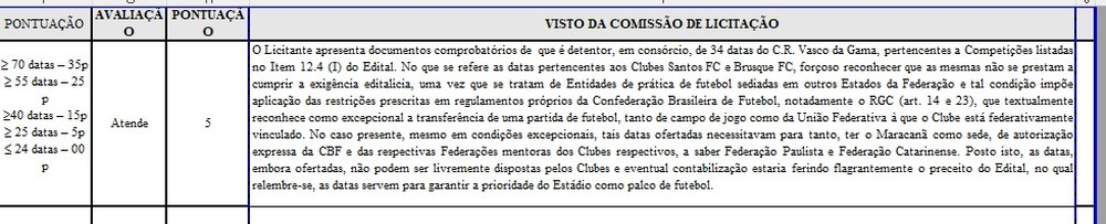 • A comissão considerou que o consórcio vascaíno e da WTorre atendeu parcialmente a três requisitos e não atendeu a dois deles por inteiro.