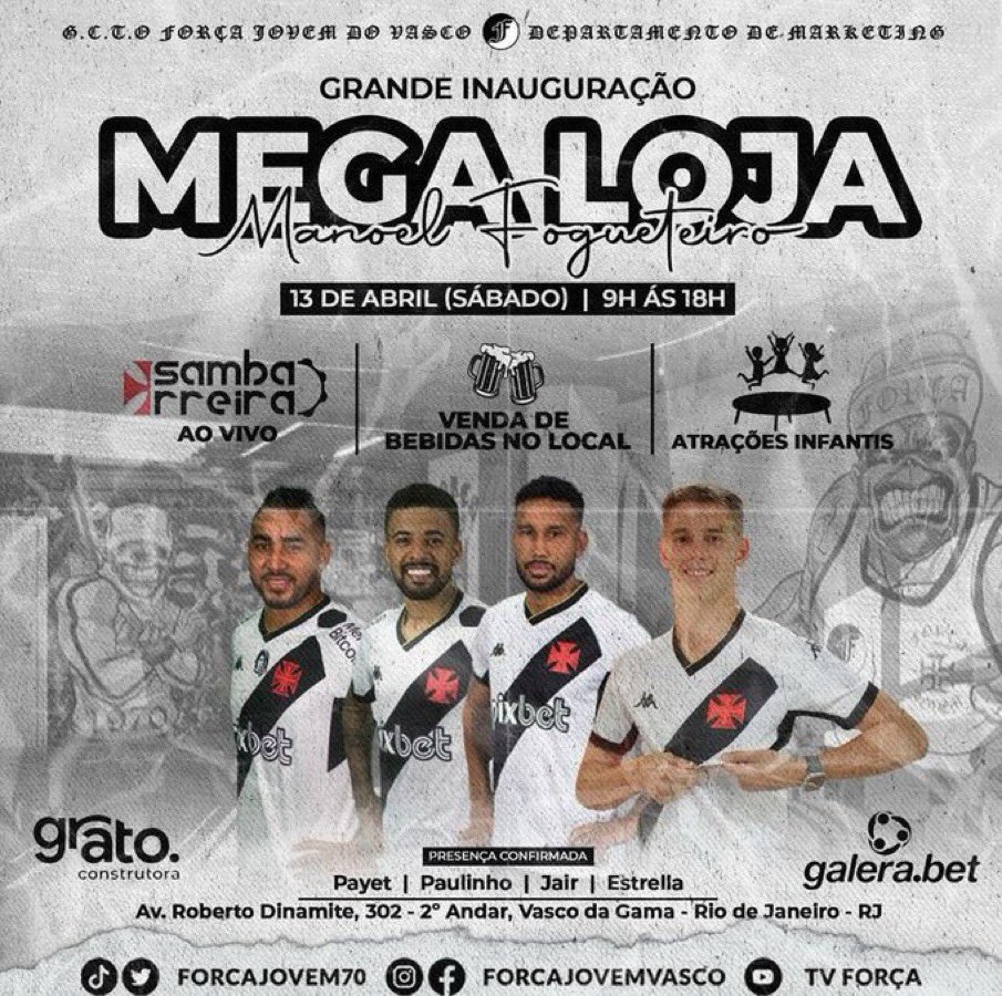 🎯| Neste sábado, a torcida organizada Força Jovem do Vasco irá realizar a inauguração de sua Mega Loja na avenida Roberto Dinamite.