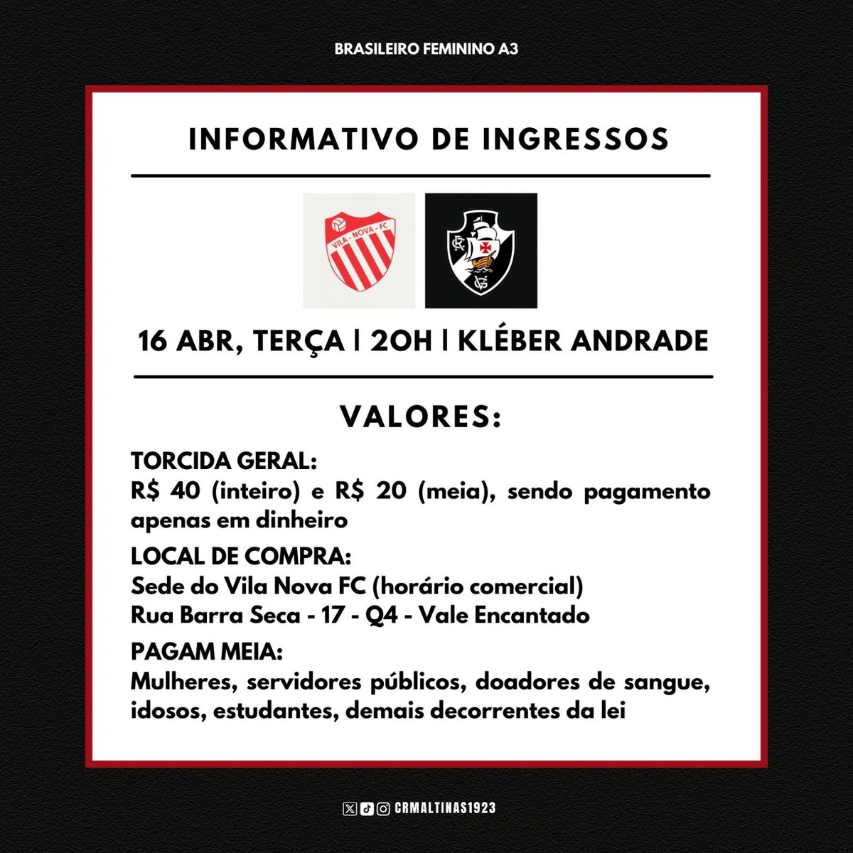 🚨 🎫 | O Vila Nova - ES divulgou informações sobre ingressos para o jogo da ida contra o @vasco_feminino, no Kleber Andrade!