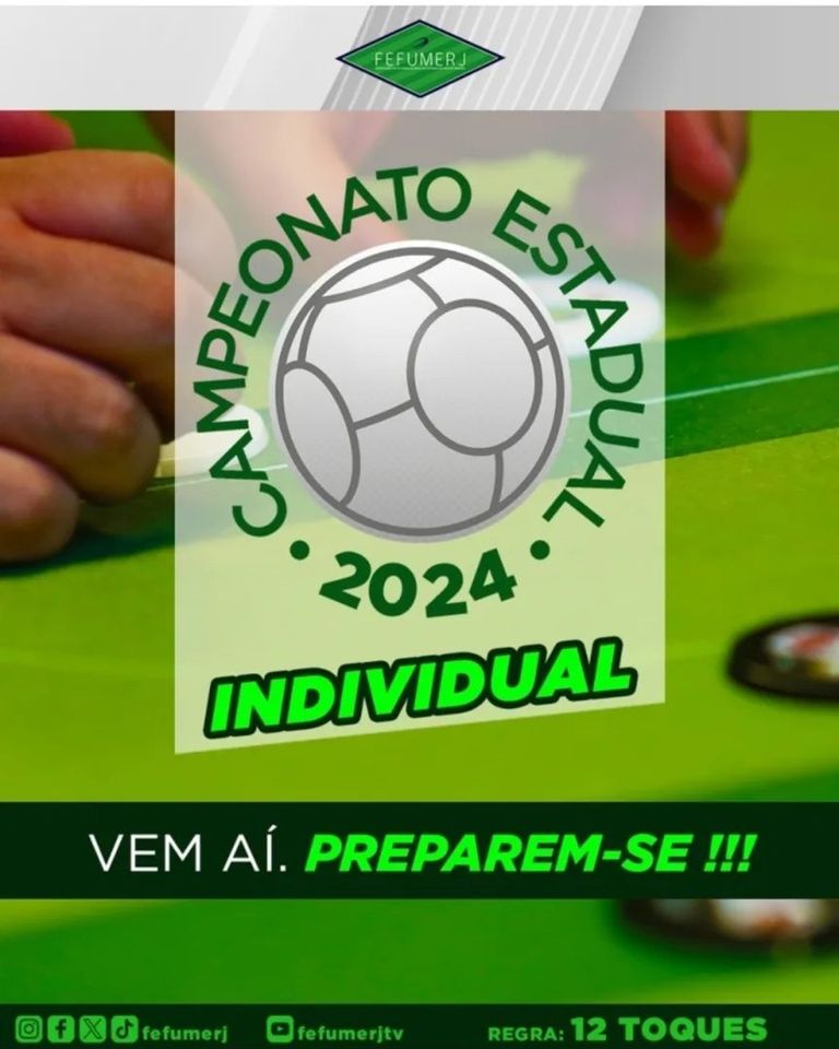 Organizado pela Fefumerj - Federação de Futebol de Mesa do Estado do Rio de Janeiro, o Campeonato Estadual Individual da Regra 12 toques começa neste fim de semana, dias 13 e 14 de abril, depois do adiamento em março devido às fortes chuvas no Estado. A 1ª Etapa será a Copa Miguel Ângelo Coutinho Lemos.