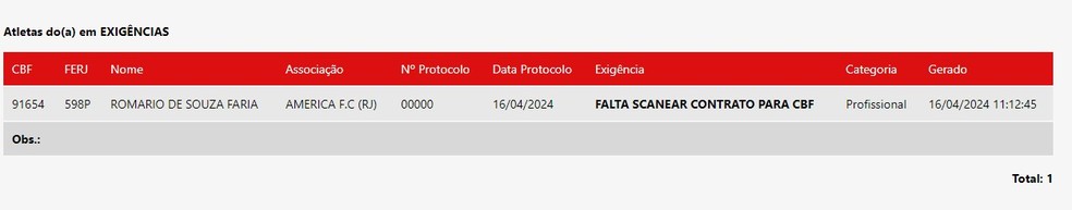Ele está inscrito no Boletim Informativo de Registro de Atletas (Bira). Inscrição feita às 11h12 desta terça-feira. No boletim, ainda falta "escanear contrato para a CBF". Romário está aposentado do futebol desde 2009, quando disputou poucas partidas também pelo America, time que aprendeu a amar com o pai, seu Edevair.