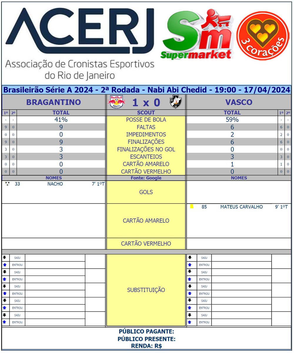 Scout do 1º Tempo de Bragantino e Vasco pela 2ª Rodada do Campeonato Brasileiro 2024 no Nabi Abi Chedid (Fonte: Google) #Acerjinforma #brasileirao2024 #RBBxVAS #RedBullBragantino #Vasco @Brasileirao @RedBullBraga @VascodaGama
