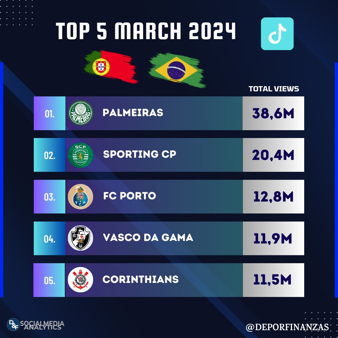 📲⚽ Os 5 clubes dos países de lingua portuguesa com mais visualizações no #TikTok durante março 2024!