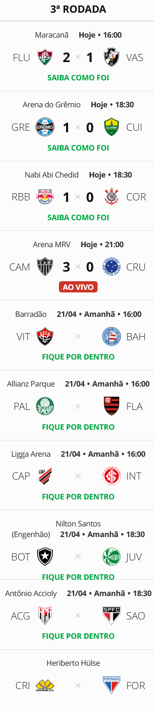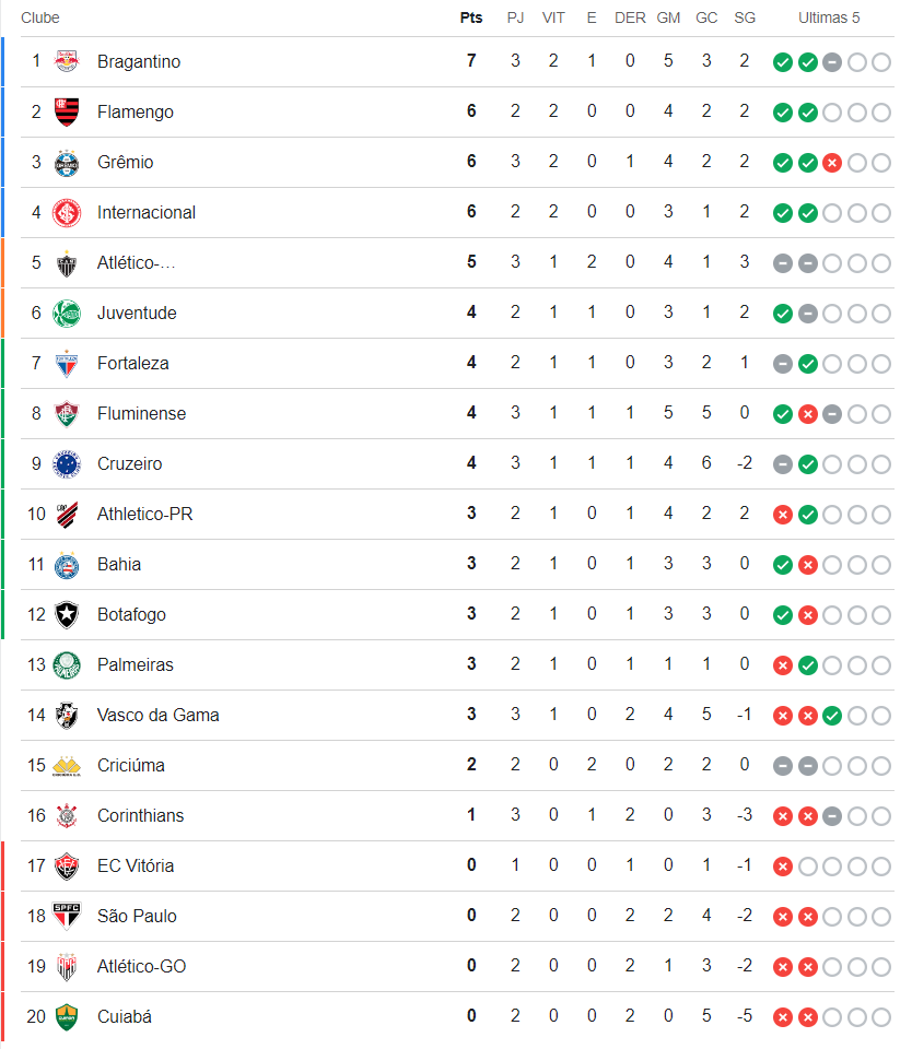 Após os jogos de sábado da 3ª rodada do Campeonato Brasileiro, o Vasco, que foi derrotado pelo Fluminense por 2 a 1, está na 14ª colocação.