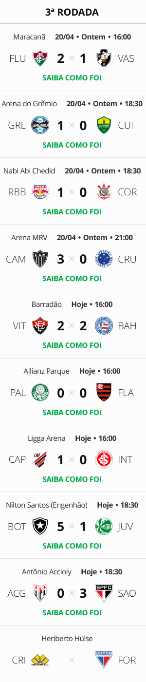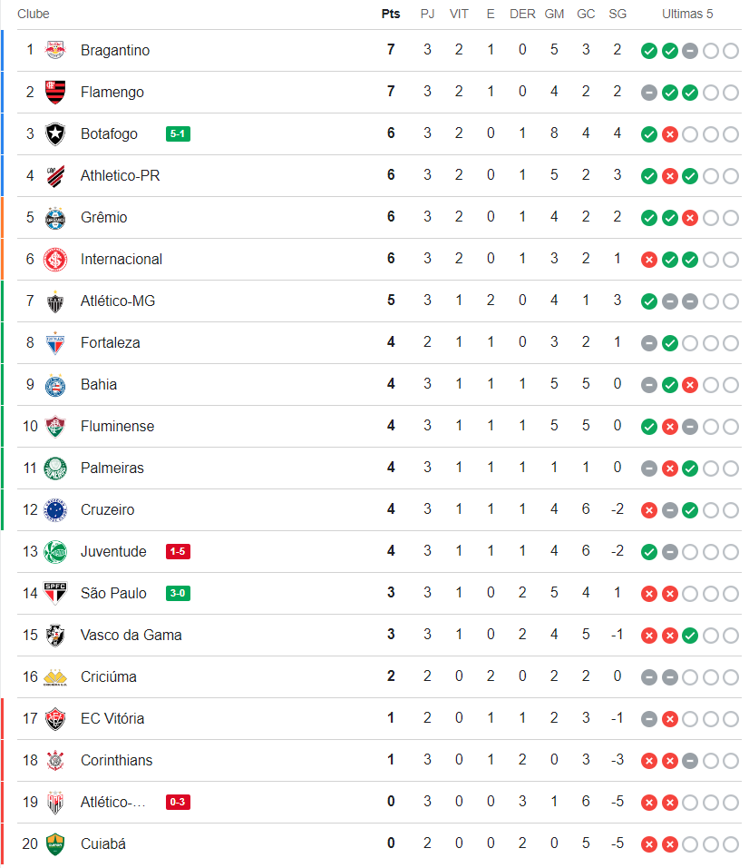 A um jogo do fim da 3ª rodada do Campeonato Brasileiro (Criciúma x Fortaleza foi adiado sem data definida), o Vasco, que perdeu para o Fluminense por 2 a 1, está na 15ª colocação. Fortaleza, Criciúma, Vitória e Cuiabá têm um jogo a menos que os demais concorrentes. Os três últimos estão atrás do Gigante da Colina na classificação.