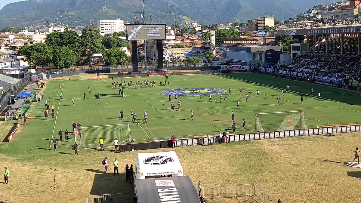 Jogadores de Vasco e Criciúma se aquecem no gramado de São Januário