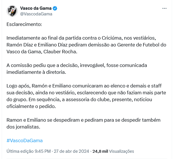 Imediatamente ao final da partida contra o Criciúma, nos vestiários, Ramón Díaz e Emiliano Díaz pediram demissão ao Gerente de Futebol do Vasco da Gama, Clauber Rocha.