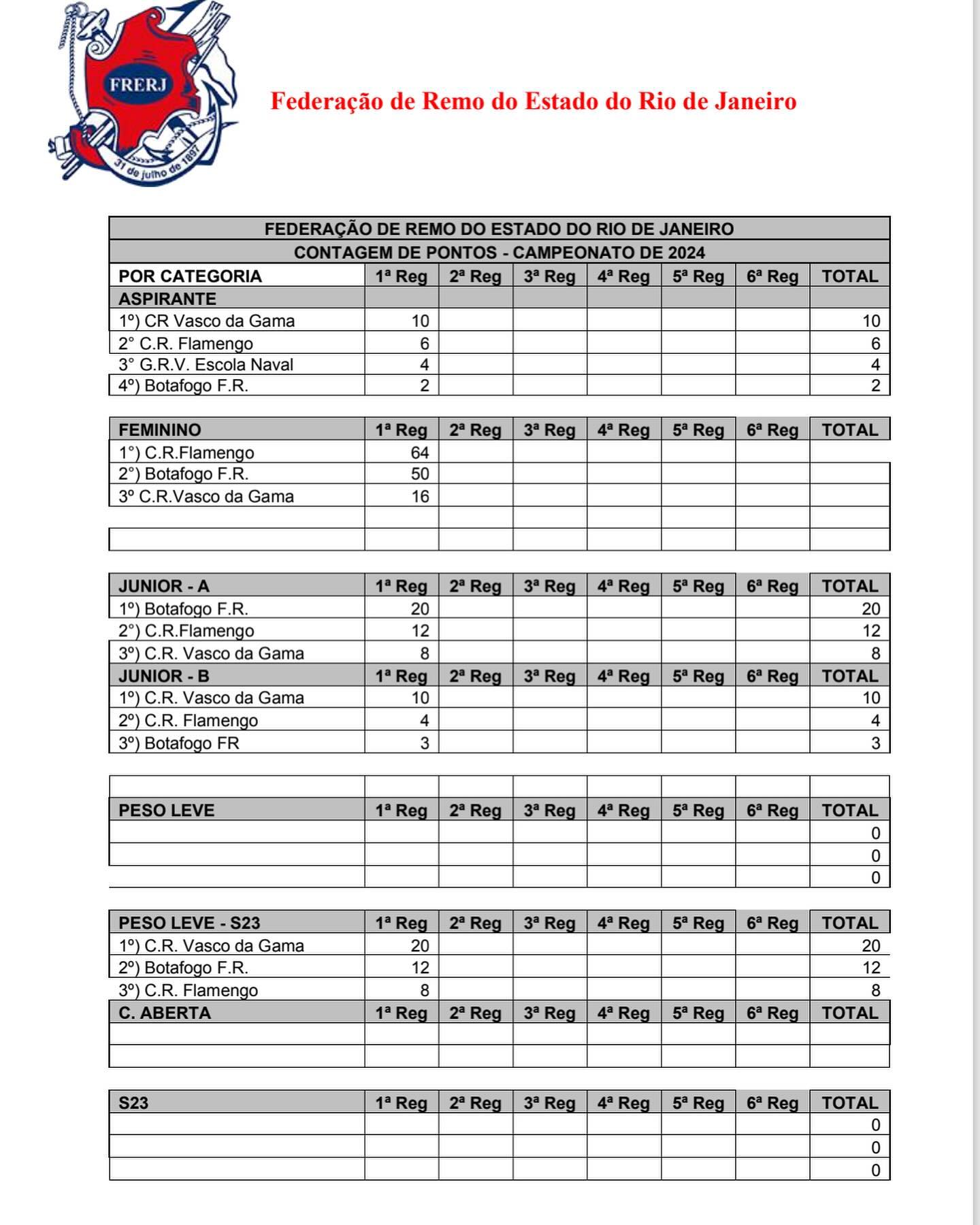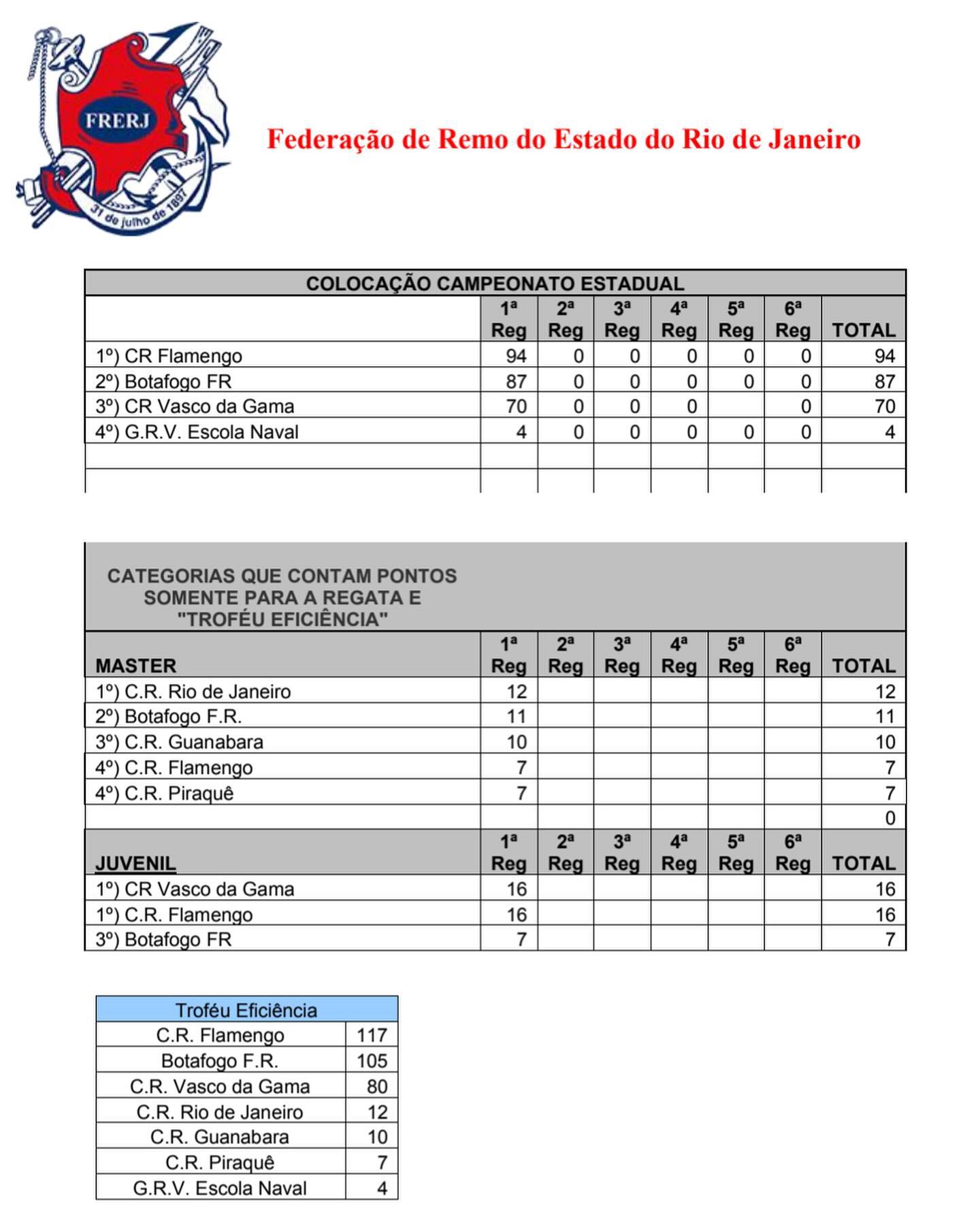 Resultados do Campeonato Estadual de Remo após a 1a. Regata (contagem de pontos, colocação geral e Troféu Eficiência). A próxima etapa do Campeonato acontecerá no dia 02 de junho de 2024, no Estádio de Remo da Lagoa Rodrigo de Freitas. Esperamos por todos lá.