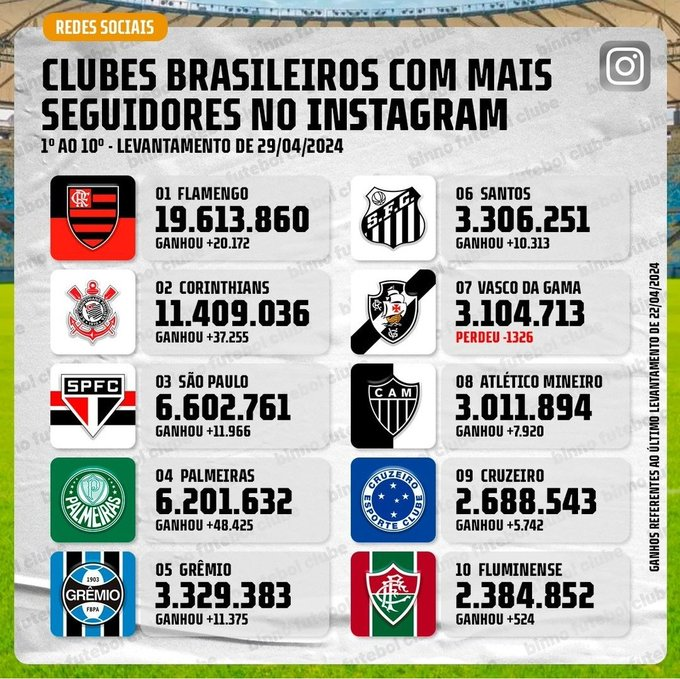 No top 10 de clubes com mais seguidores no Instagram, o Vasco foi o único perfil que perdeu seguidores.