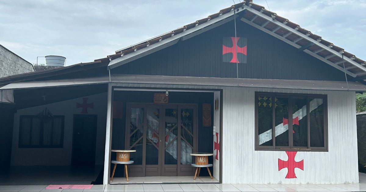 Com isso, entrou em contato com o cunhado, que é desenhista, e ele começou a criar o projeto. Elizete diz que ajudou a cortar as cruzes de malta e também a pintar algumas paredes para o cunhado desenhar depois.