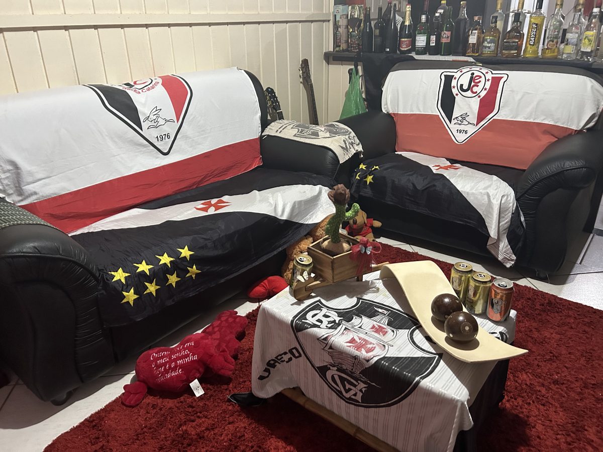 No sofá, um detalhe chama a atenção: a bandeira do Joinville Esporte Clube (JEC). Elizete relata que o Vasco da Gama é o clube do seu coração, mas acredita ser importante apoiar o clube de futebol da cidade onde mora.