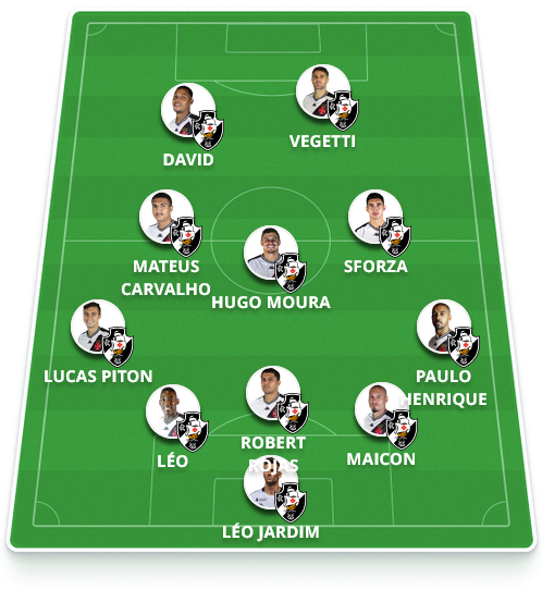 Provável time do Vasco: Léo Jardim, Paulo Henrique, Rojas, Maicon, Léo, Lucas Piton, Sforza, Hugo Moura, Mateus Cocão, David e Vegetti.