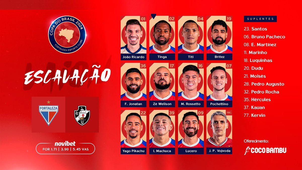Veja a escalação do Fortaleza para o jogo contra o Vasco; ex-vascaínos Titi e Yago Pikachu são titulares