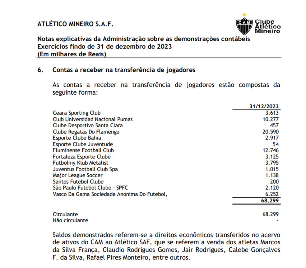 O Atlético-MG tem valores a receber de 14 clubes referentes a venda de jogadores. O Flamengo encabeça o topo da lista: R$ 20,5 milhões pela compra do volante Allan no meio de 2023. Os dados são do balanço financeiro do clube divulgado na última semana.
