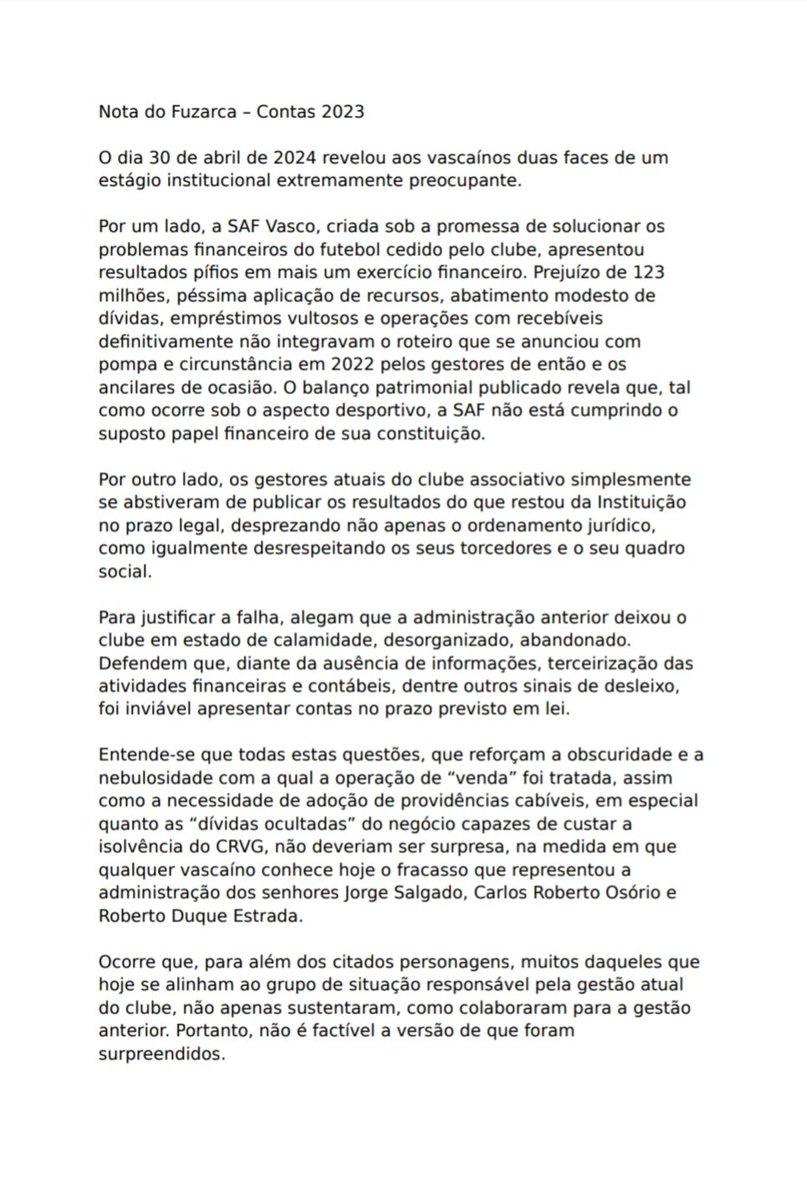 Fuzarca publica nota sobre o balanço da Vasco SAF e não publicação do balanço do CRVG