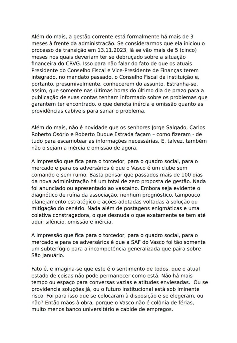 Nota em relação às contas prestadas pela SAF Vasco e sobre a ausência de prestação de contas por parte da Associação.